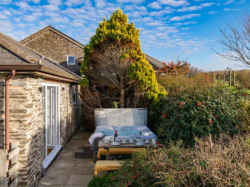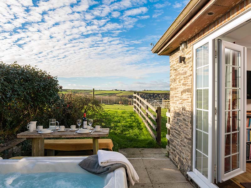 Double-glazed French doors open from the living area onto a southerly aspect fenced garden, with views over rolling fields and the Little Petherick Creek valley. The patio can be lit at night by an outside light and patio furniture is provided for guest use. The hot tub is situated outisde the French doors. There is gated access directly to our “sheep playing field”.